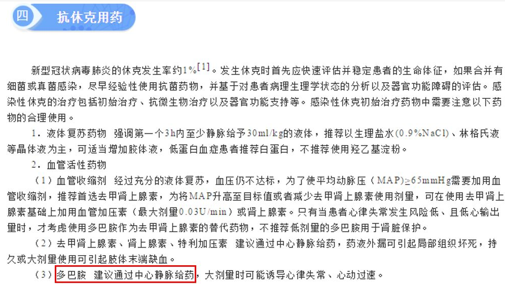 近日由国家卫健委办公厅最新公布的《新型冠状病毒感染的肺炎诊疗方案试行第六版》再次提到重型、危重型病例的治疗,循环支持中应使用血管活性药物。此外先后发布的《重症新型冠状病毒感染肺炎诊疗与管理共识》与《新型冠状病毒肺炎临床合理用药专家共识》在血管活性药物的应用中均推荐使用多巴胺作为抗休克的选择。